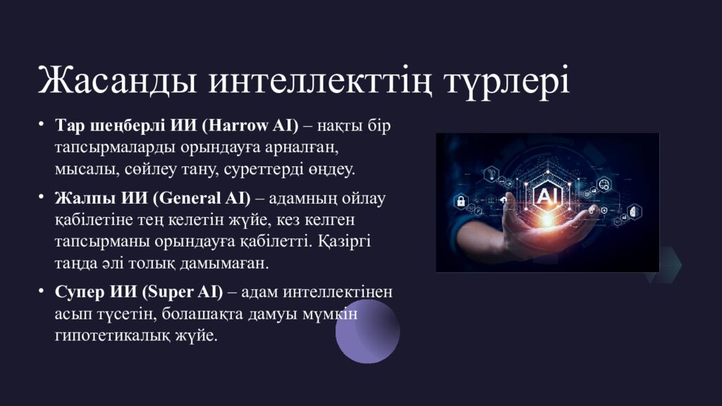 Тар шеңберлі ИИ ( Нarrow AI) – нақты бір тапсырмаларды орындауға арналған, мысалы, сөйлеу тану, суреттерді өңдеу. Жалпы ИИ (General AI) – адамның ойлау қабілетіне тең келетін жүйе, кез келген тапсырманы орындауға қабілетті. Қазіргі таңда әлі толық дамымаған. Супер ИИ (Super AI) – адам интеллектінен асып түсетін, болашақта дамуы мүмкін гипотетикалық жүйе.