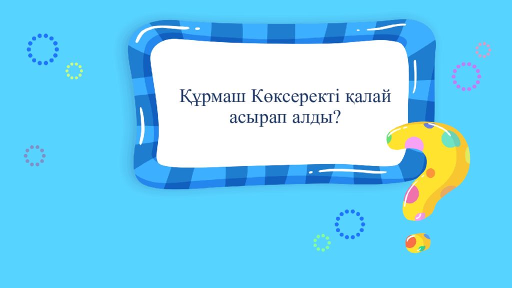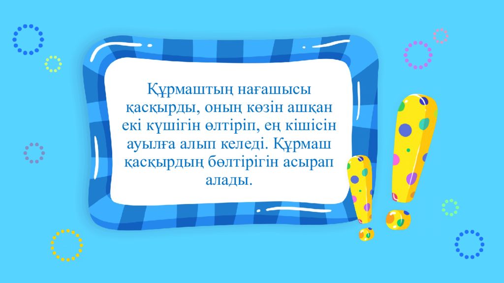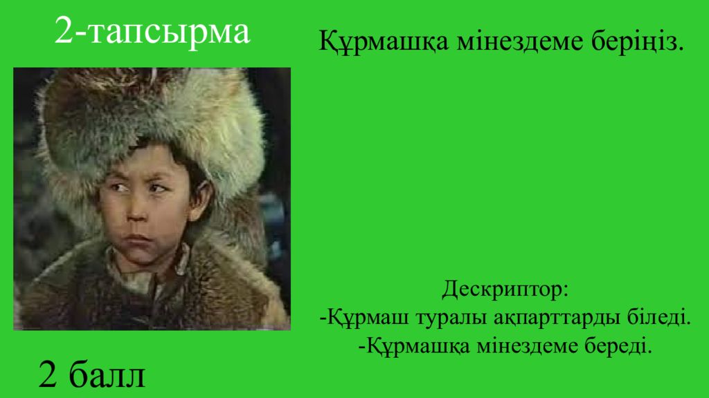 Құрмашқа мінездеме беріңіз. 2 балл 2-тапсырма Дескриптор: -Құрмаш туралы ақпарттарды біледі. -Құрмашқа мінездеме береді.