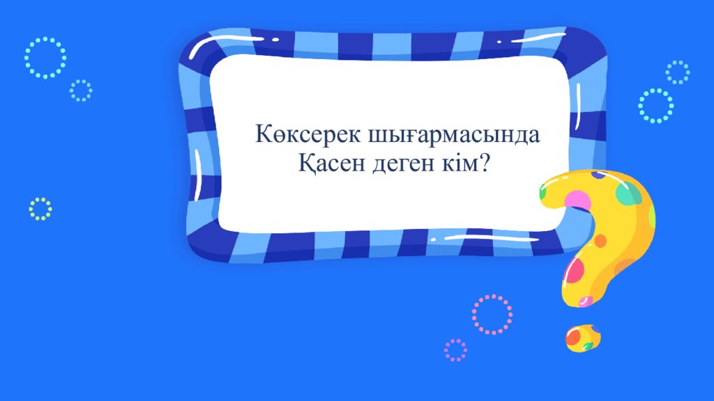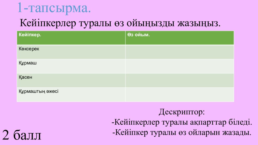 Кейіпкер. Өз ойым. Көксерек Құрмаш Қасен Құрмаштың әжесі Кейіпкерлер туралы өз ойыңызды жазыңыз. 1-тапсырма. Дескриптор: -Кейіпкерлер туралы ақпарттар біледі. -Кейіпкер туралы өз ойларын жазады. 2 балл