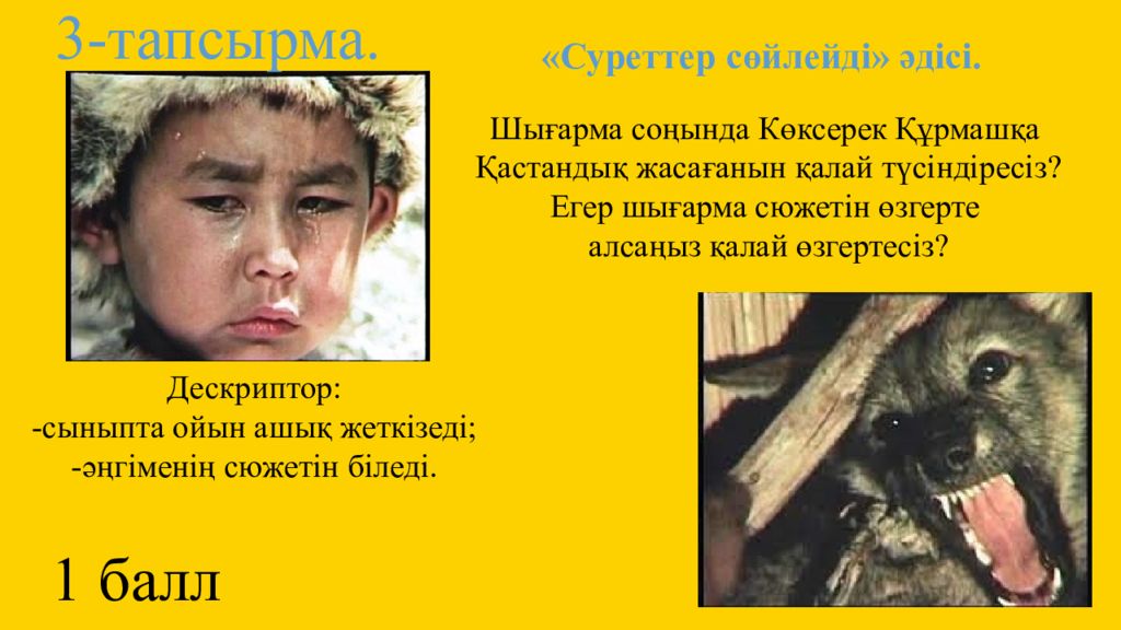 «Суреттер сөйлейді» әдісі. Шығарма соңында Көксерек Құрмашқа Қастандық жасағанын қалай түсіндіресіз? Егер шығарма сюжетін өзгерте алсаңыз қалай өзгертесіз? Дескриптор: -сыныпта ойын ашық жеткізеді; -әңгіменің сюжетін біледі. 1 балл 3-тапсырма.