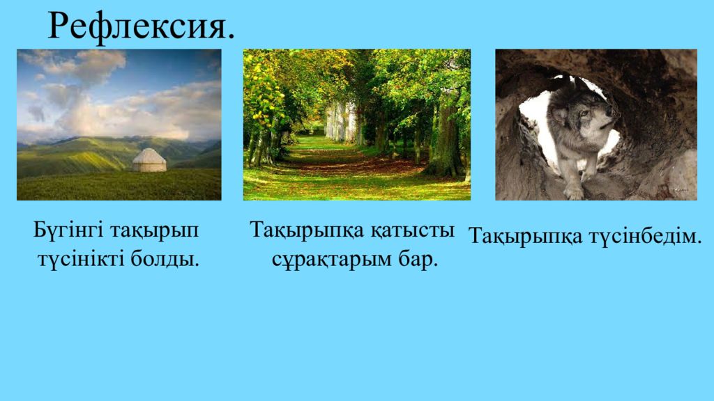Бүгінгі тақырып түсінікті болды. Тақырыпқа қатысты сұрақтарым бар. Тақырыпқа түсінбедім. Рефлексия.