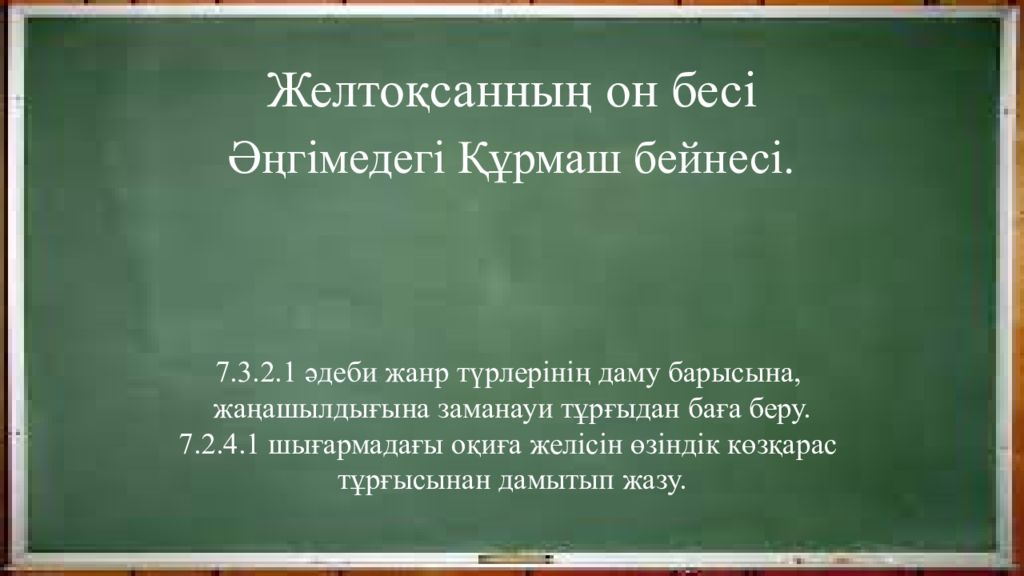 Желтоқсанның он бесі Әңгімедегі Құрмаш бейнесі. 7.3.2.1 әдеби жанр түрлерінің даму барысына, жаңашылдығына заманауи тұрғыдан баға беру. 7.2.4.1 шығармадағы оқиға желісін өзіндік көзқарас тұрғысынан дамытып жазу.