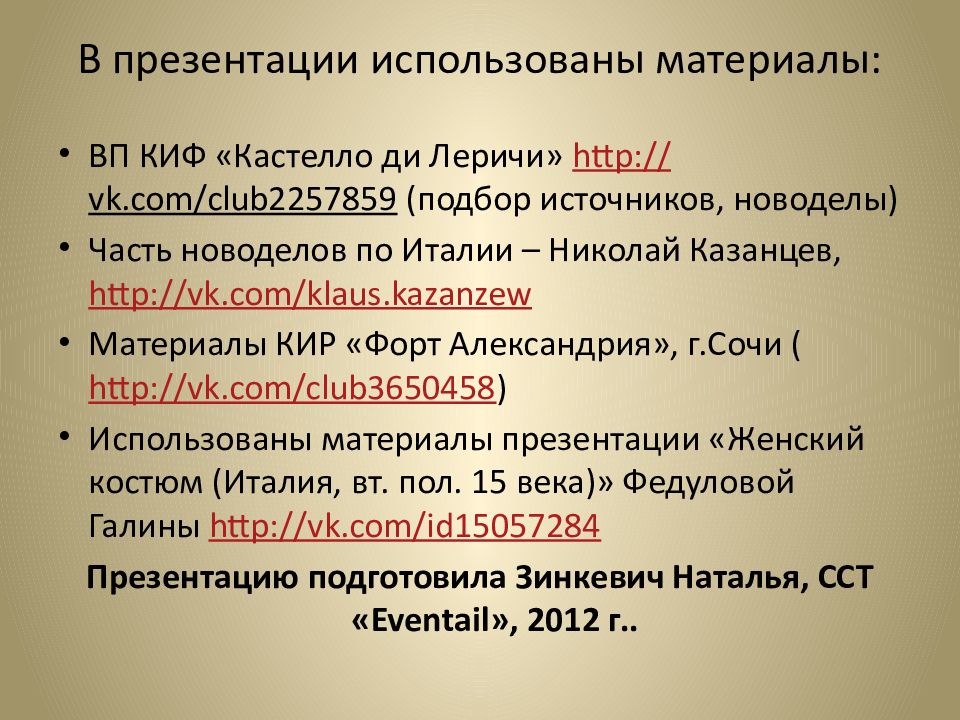 ВП КИФ « Кастелло ди Леричи » http:// vk.com/club2257859 (подбор источников, новоделы ) Часть новоделов по Италии – Николай Казанцев, http:// vk.com/klaus.kazanzew Материалы КИР «Форт Александрия», г.Сочи ( http://vk.com/club3650458 ) Использованы материалы презентации «Женский костюм (Италия, вт. п ол. 15 века)» Федуловой Галины http:// vk.com/id15057284 Презентацию подготовила Зинкевич Наталья, ССТ « Eventail », 2012 г..