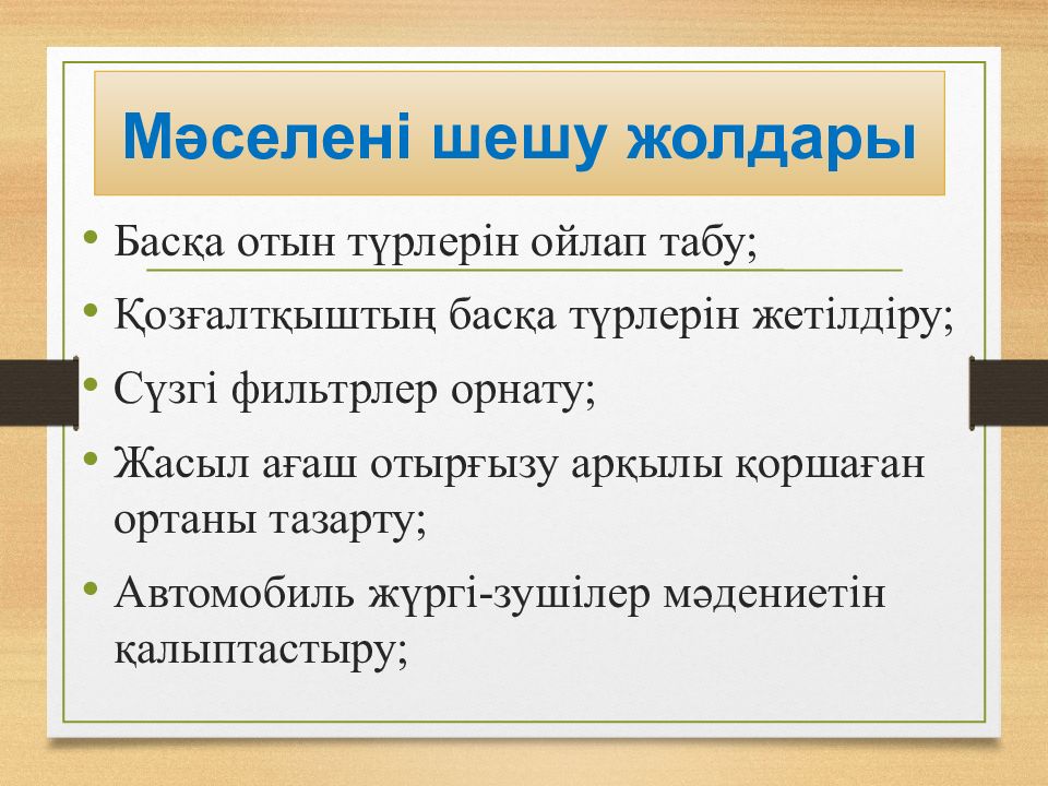 Басқа отын түрлерін ойлап табу; Қозғалтқыштың басқа түрлерін жетілдіру ; Сүзгі фильтрлер орнату ; Жасыл ағаш отырғызу арқылы қоршаған ортаны тазарту ; Автомобиль жүргі-зушілер мәдениетін қалыптастыру ;