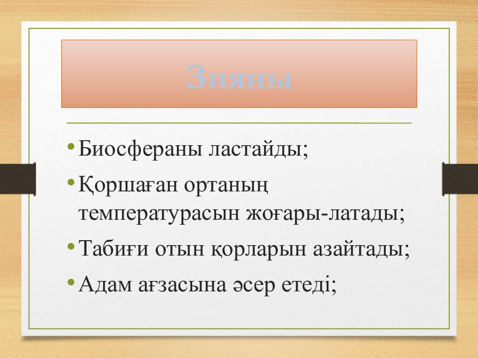 Биосфераны ластайды ; Қоршаған ортаның температурасын жоғары-латады; Табиғи отын қорларын азайтады ; Адам ағзасына әсер етеді ;
