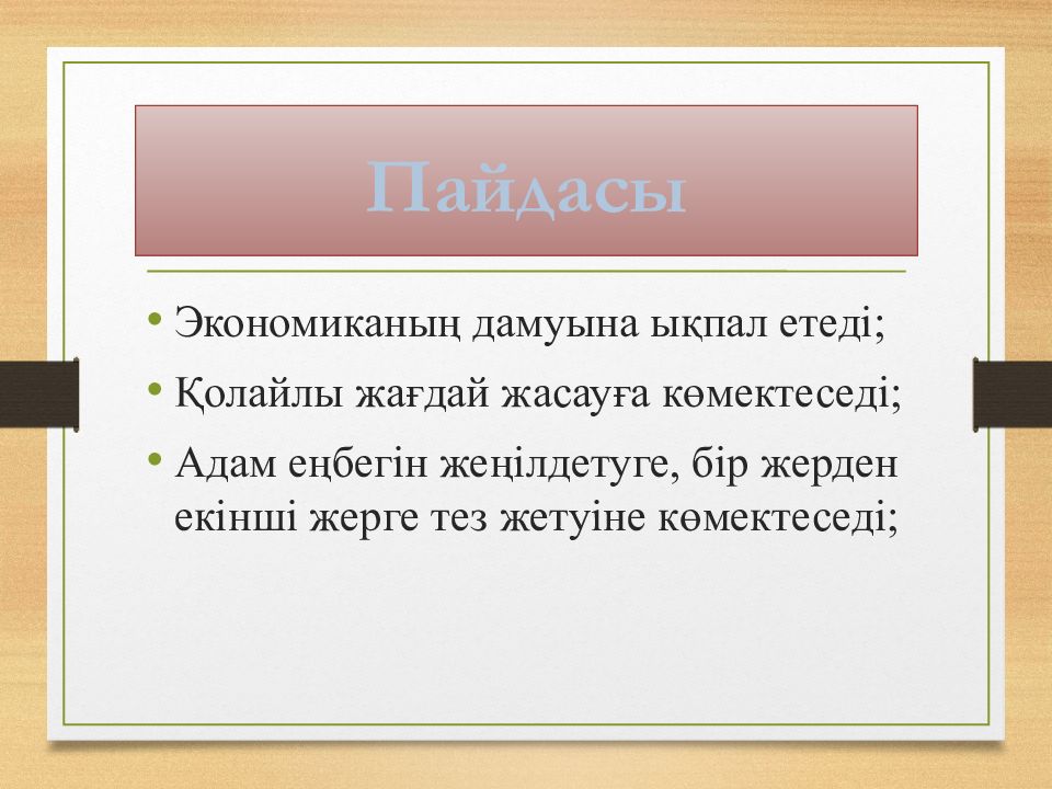 Экономиканың дамуына ықпал етеді ; Қолайлы жағдай жасауға көмектеседі; Адам еңбегін жеңілдетуге, бір жерден екінші жерге тез жетуіне көмектеседі ;