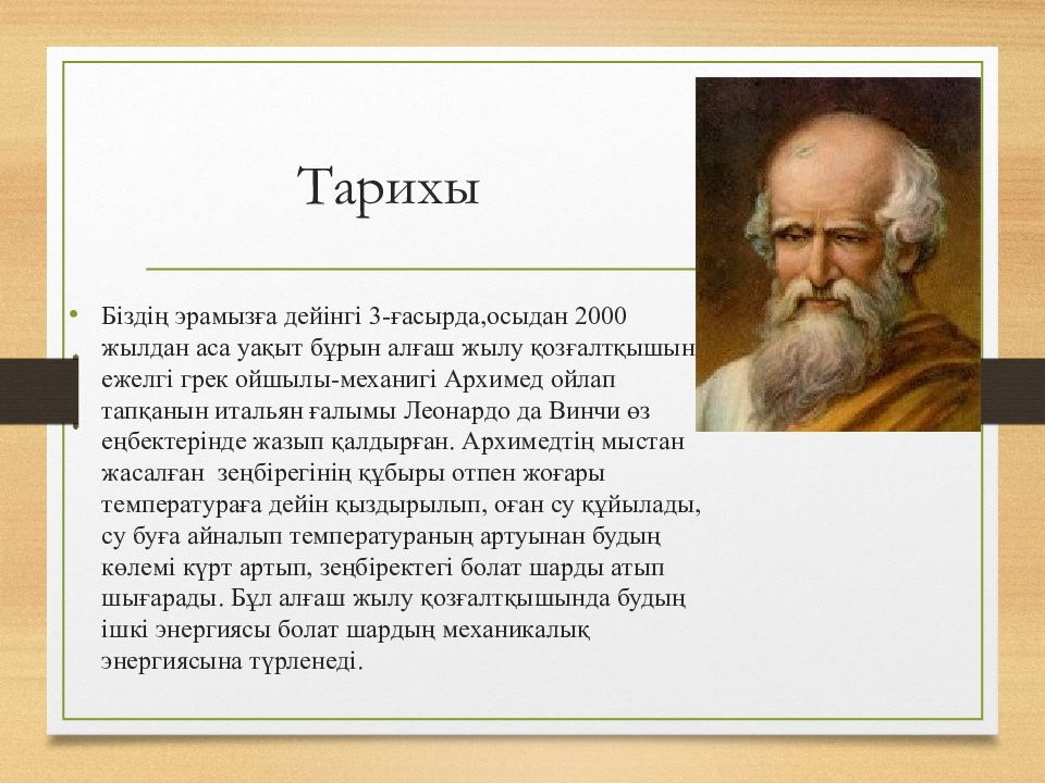 Біздің эрамызға дейінгі 3-ғасырда,осыдан 2000 жылдан аса уақыт бұрын алғаш жылу қозғалтқышын ежелгі грек ойшылы-механигі Архимед ойлап тапқанын итальян ғалымы Леонардо да Винчи өз еңбектерінде жазып қалдырған. Архимедтің мыстан жасалған зеңбірегінің құбыры отпен жоғары температураға дейін қыздырылып, оған су құйылады, су буға айналып температураның артуынан будың көлемі күрт артып, зеңбіректегі болат шарды атып шығарады. Бұл алғаш жылу қозғалтқышында будың ішкі энергиясы болат шардың механикалық энергиясына түрленеді.