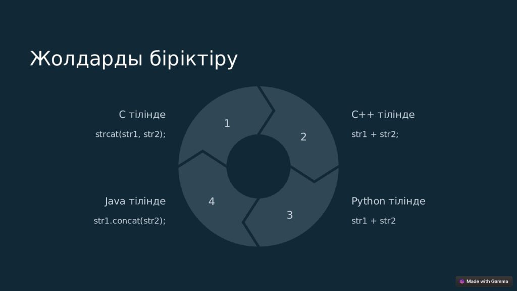 Жолдарды біріктіру C тілінде strcat(str1, str2); 1 C++ тілінде str1 + str2; 2 Python тілінде str1 + str2 3 Java тілінде str1.concat(str2); 4