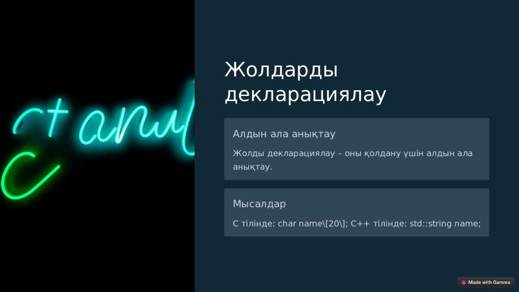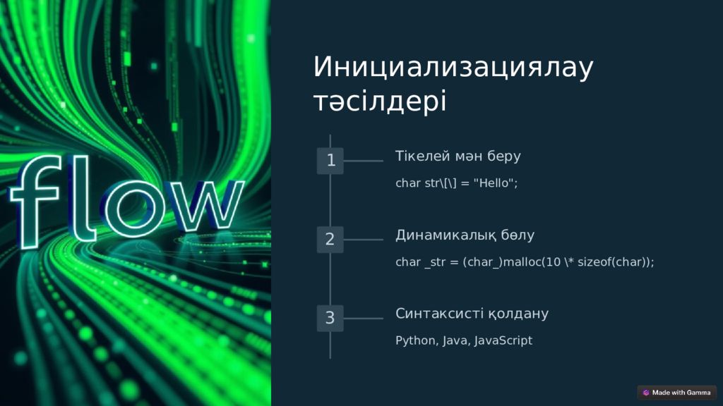 Инициализациялау тәсілдері 1 Тікелей мән беру char str\[\] = "Hello"; 2 Динамикалық бөлу char _str = (char_)malloc(10 \* sizeof(char)); 3 Синтаксисті қолдану Python, Java, JavaScript