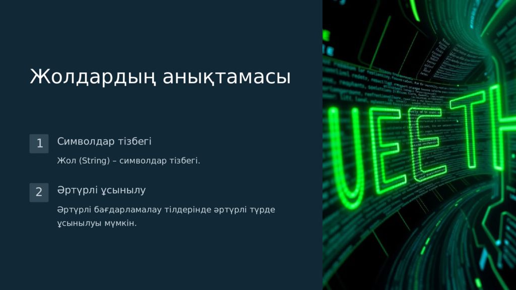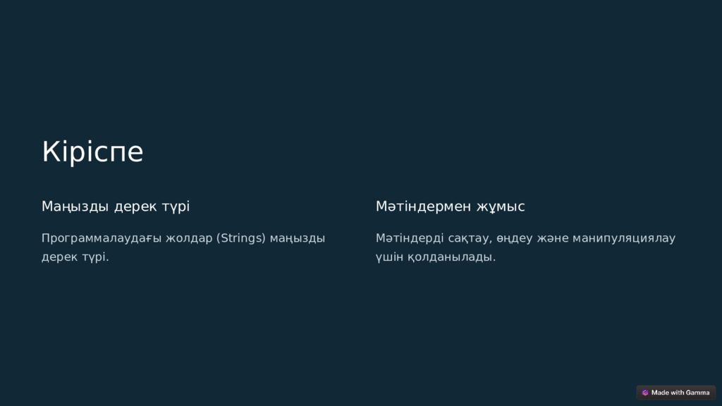 Кіріспе Маңызды дерек түрі Программалаудағы жолдар (Strings) маңызды дерек түрі. Мәтіндермен жұмыс Мәтіндерді сақтау, өңдеу және манипуляциялау үшін қолданылады.