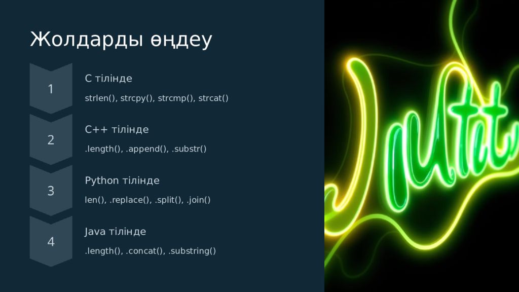 Жолдарды өңдеу C тілінде strlen(), strcpy(), strcmp(), strcat() C++ тілінде .length(),.append(),.substr() Python тілінде len(),.replace(),.split(),.join() Java тілінде .length(),.concat(),.substring()