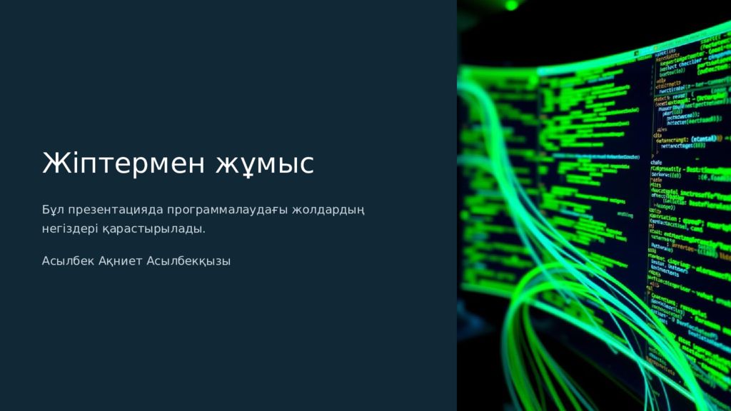 Жіптермен жұмыс Бұл презентацияда программалаудағы жолдардың негіздері қарастырылады. Асылбек Ақниет Асылбекқызы