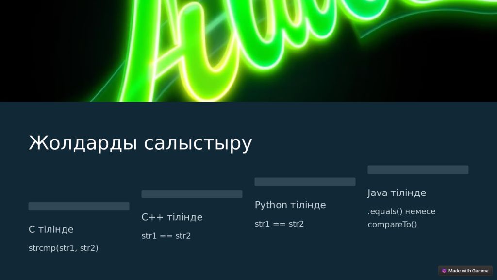Жолдарды салыстыру C тілінде strcmp(str1, str2) C++ тілінде str1 == str2 Python тілінде str1 == str2 Java тілінде .equals() немесе compareTo()