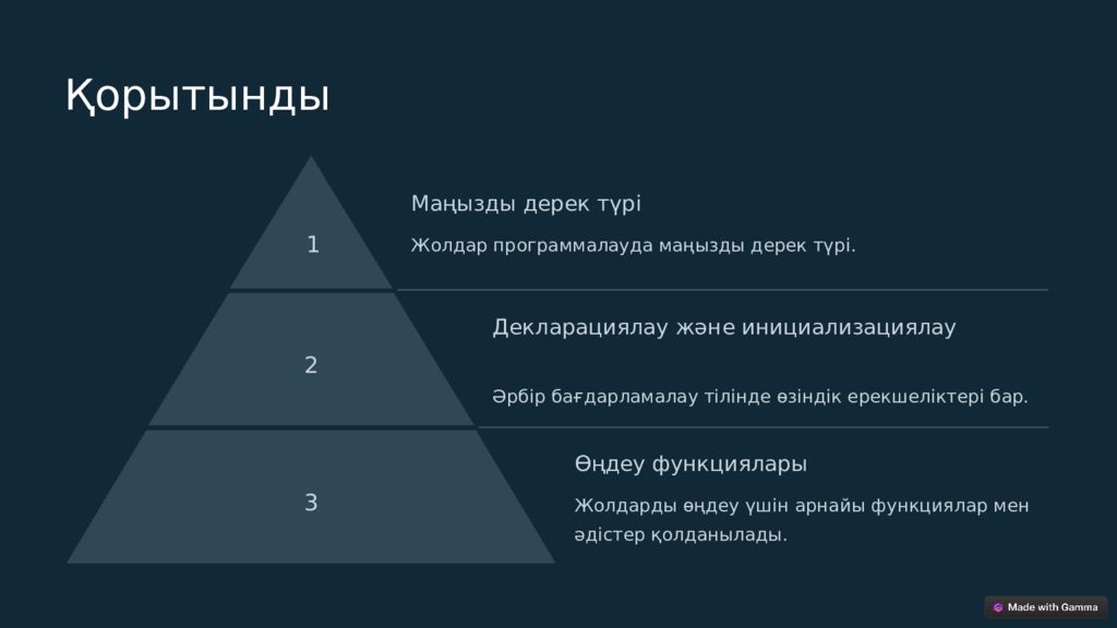 Қорытынды 1 Маңызды дерек түрі Жолдар программалауда маңызды дерек түрі. 2 Декларациялау және инициализациялау Әрбір бағдарламалау тілінде өзіндік ерекшеліктері бар. 3 Өңдеу функциялары Жолдарды өңдеу үшін арнайы функциялар мен әдістер қолданылады.