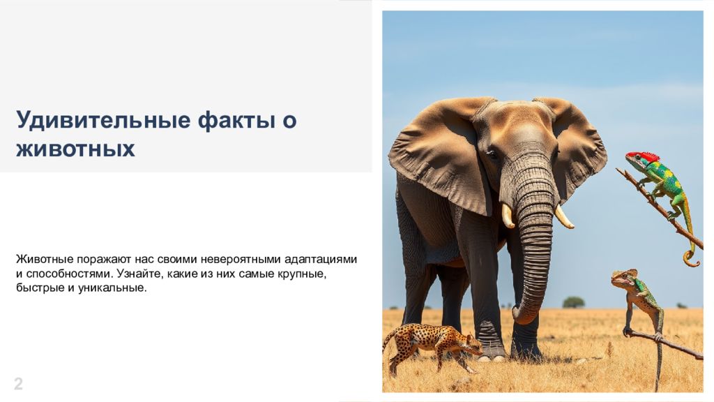 Животные поражают нас своими невероятными адаптациями и способностями. Узнайте, какие из них самые крупные, быстрые и уникальные. Удивительные факты о животных 2