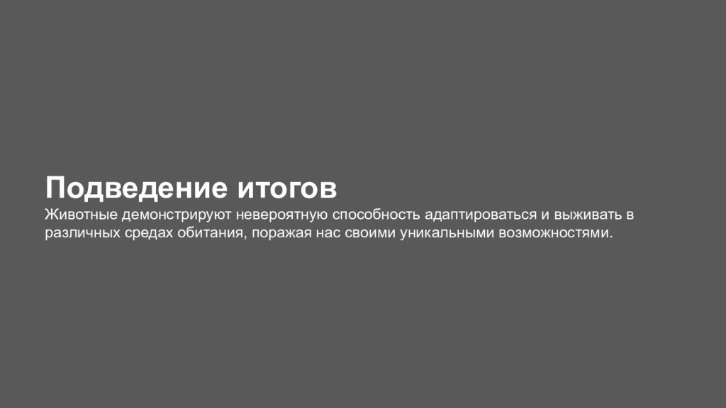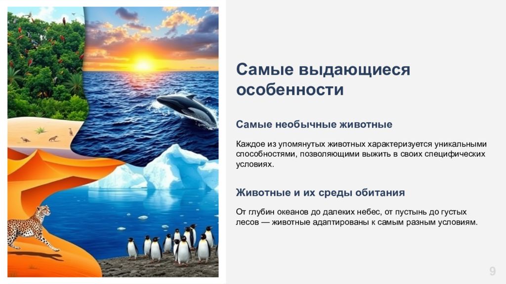 9 Самые выдающиеся особенности Самые необычные животные Каждое из упомянутых животных характеризуется уникальными способностями, позволяющими выжить в своих специфических условиях. Животные и их среды обитания От глубин океанов до далеких небес, от пустынь до густых лесов — животные адаптированы к самым разным условиям.