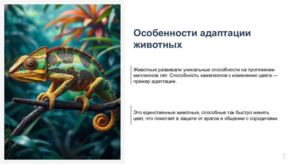 Особенности адаптации животных Животные развивали уникальные способности на протяжении миллионов лет. Способность хамелеонов к изменению цвета — пример адаптации. Это единственные животные, способные так быстро менять цвет, что помогает в защите от врагов и общении с сородичами. 7