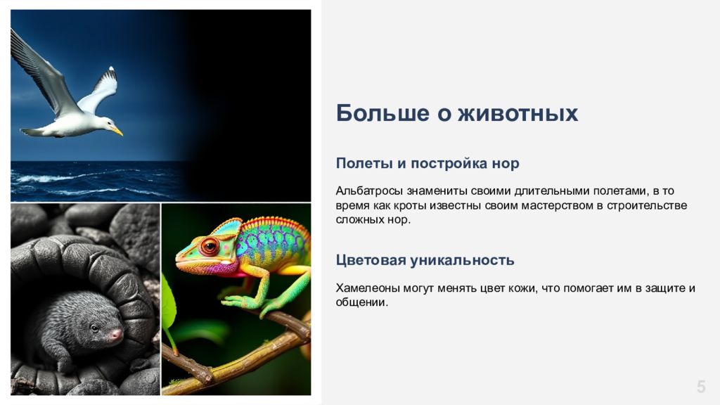 5 Больше о животных Полеты и постройка нор Альбатросы знамениты своими длительными полетами, в то время как кроты известны своим мастерством в строительстве сложных нор. Цветовая уникальность Хамелеоны могут менять цвет кожи, что помогает им в защите и общении.