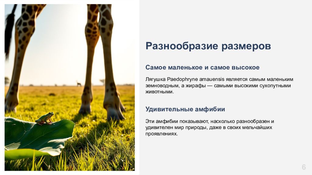 6 Разнообразие размеров Самое маленькое и самое высокое Лягушка Paedophryne amauensis является самым маленьким земноводным, а жирафы — самыми высокими сухопутными животными. Удивительные амфибии Эти амфибии показывают, насколько разнообразен и удивителен мир природы, даже в своих мельчайших проявлениях.