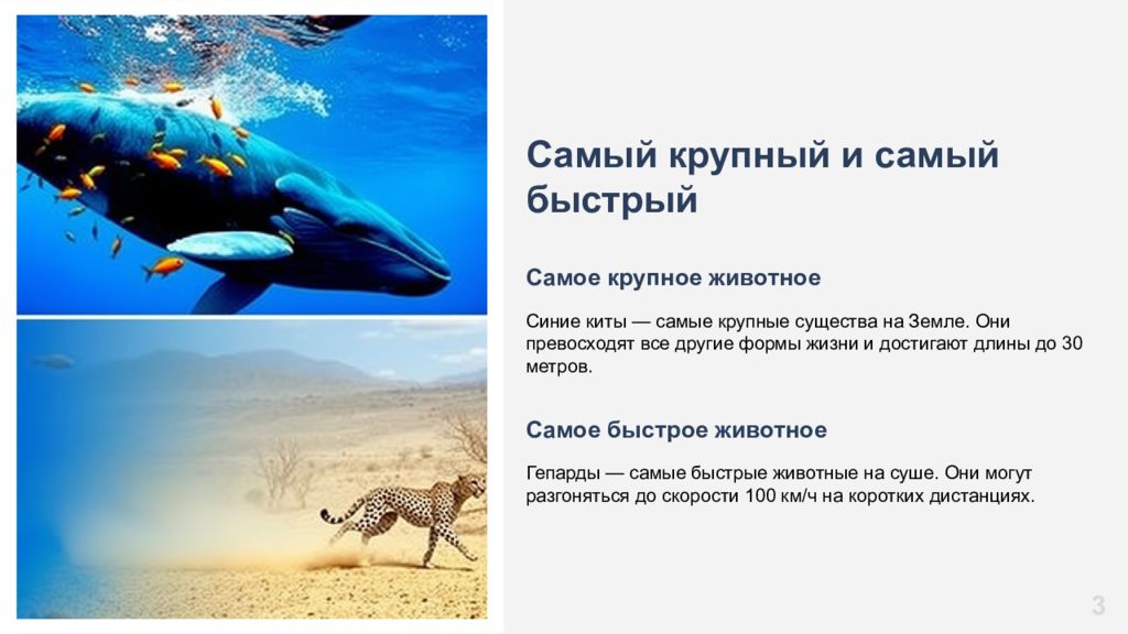 3 Самый крупный и самый быстрый Самое крупное животное Синие киты — самые крупные существа на Земле. Они превосходят все другие формы жизни и достигают длины до 30 метров. Самое быстрое животное Гепарды — самые быстрые животные на суше. Они могут разгоняться до скорости 100 км/ч на коротких дистанциях.