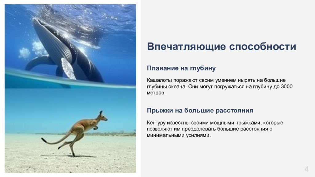 4 Впечатляющие способности Плавание на глубину Кашалоты поражают своим умением нырять на большие глубины океана. Они могут погружаться на глубину до 3000 метров. Прыжки на большие расстояния Кенгуру известны своими мощными прыжками, которые позволяют им преодолевать большие расстояния с минимальными усилиями.