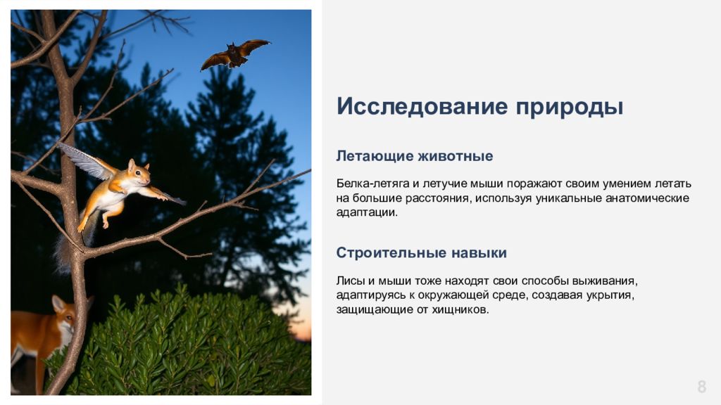 8 Исследование природы Летающие животные Белка-летяга и летучие мыши поражают своим умением летать на большие расстояния, используя уникальные анатомические адаптации. Строительные навыки Лисы и мыши тоже находят свои способы выживания, адаптируясь к окружающей среде, создавая укрытия, защищающие от хищников.