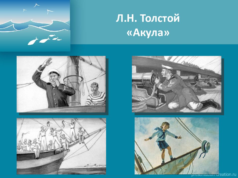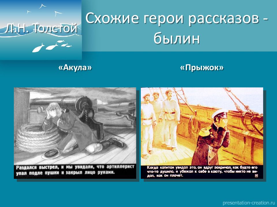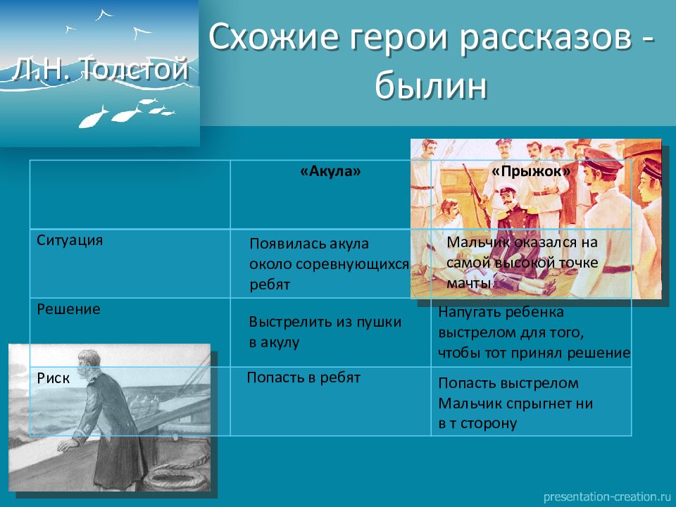 Схожие герои рассказов - былин Л.Н. Толстой «Акула» «Прыжок» Ситуация Решение Риск Появилась акула около соревнующихся ребят Мальчик оказался на самой высокой точке мачты Выстрелить из пушки в акулу Напугать ребенка выстрелом для того, чтобы тот принял решение Попасть в ребят Попасть выстрелом Мальчик спрыгнет ни в т сторону