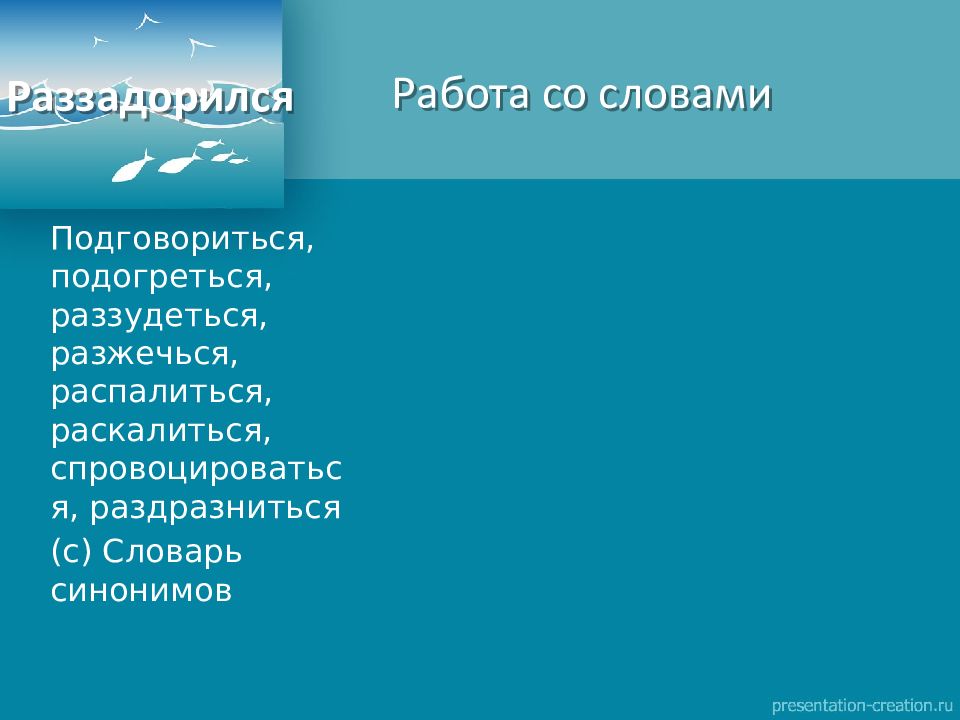 Подговориться, подогреться, раззудеться, разжечься, распалиться, раскалиться, спровоцироваться, раздразниться (с) Словарь синонимов Работа со словами Раззадорился
