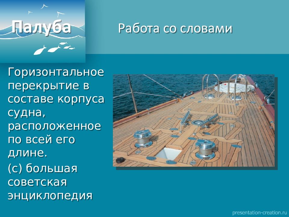 Горизонтальное перекрытие в составе корпуса судна, расположенное по всей его длине. (с) большая советская энциклопедия Работа со словами