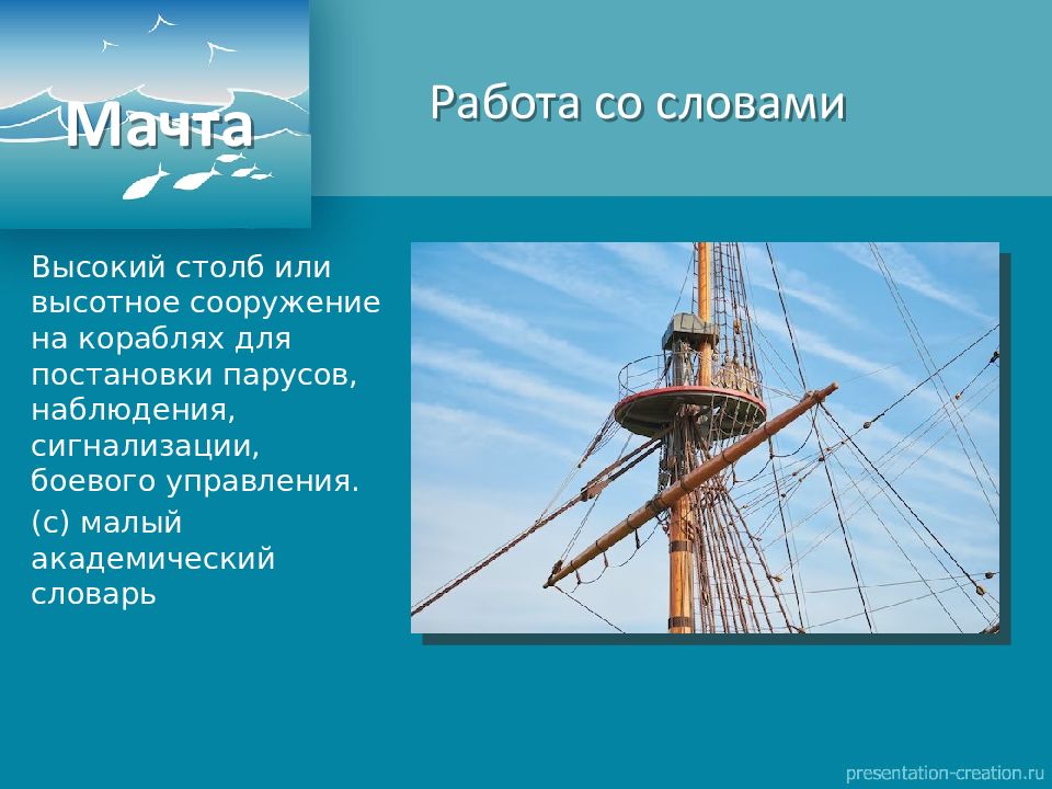 Высокий столб или высотное сооружение на кораблях для постановки парусов, наблюдения, сигнализации, боевого управления. (с) малый академический словарь Мачта Работа со словами