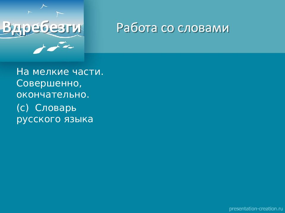 На мелкие части. Совершенно, окончательно. (с) Словарь русского языка Работа со словами Вдребезги