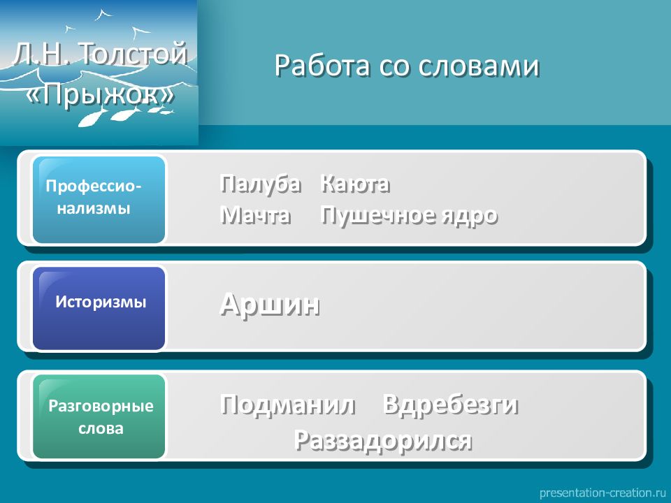 Профессио-нализмы Палуба Каюта Мачта Пушечное ядро Историзмы Аршин Разговорные слова Подманил Вдребезги Раззадорился Л.Н. Толстой «Прыжок» Работа со словами