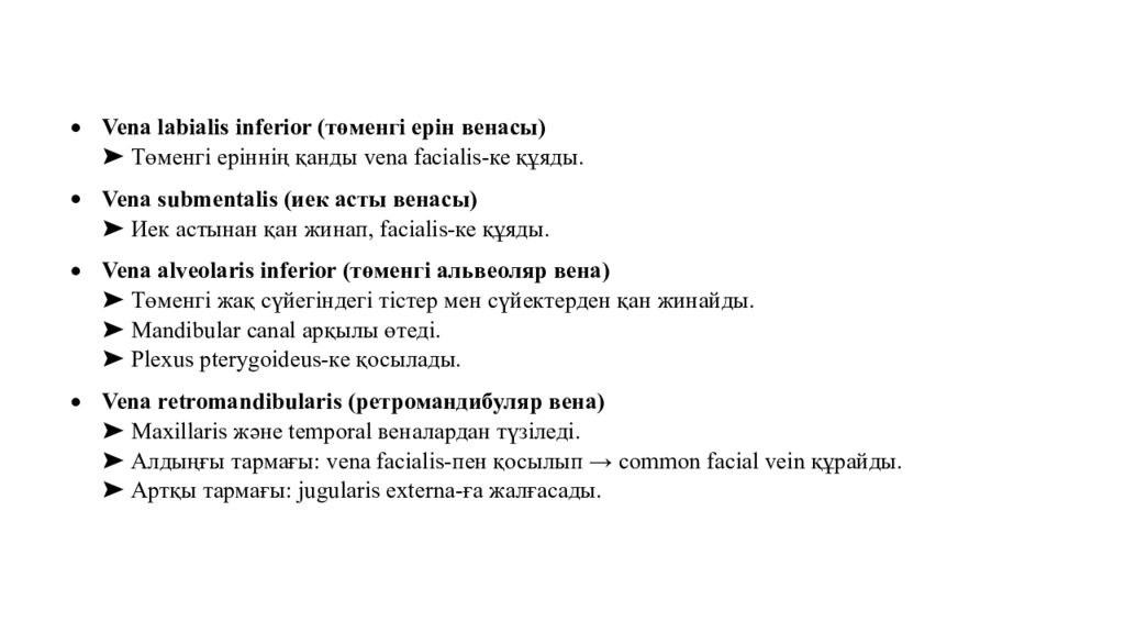 Vena labialis inferior ( төменгі ерін венасы ) ➤ Төменгі еріннің қанды vena facialis-ке құяды. Vena submentalis ( иек асты венасы ) ➤ Иек астынан қан жинап, facialis-ке құяды. Vena alveolaris inferior ( төменгі альвеоляр вена) ➤ Төменгі жақ сүйегіндегі тістер мен сүйектерден қан жинайды. ➤ Mandibular canal арқылы өтеді. ➤ Plexus pterygoideus-ке қосылады. Vena retromandibularis ( ретромандибуляр вена) ➤ Maxillaris және temporal веналардан түзіледі. ➤ Алдыңғы тармағы : vena facialis -пен қосылып → common facial vein құрайды. ➤ Артқы тармағы : jugularis externa-ға жалғасады.