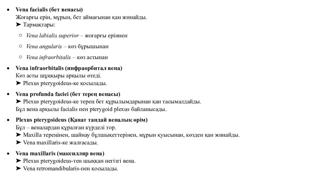 Vena facialis (бет венасы ) Жоғарғы ерін, мұрын, бет аймағынан қан жинайды. ➤ Тармақтары : Vena labialis superior – жоғарғы еріннен Vena angularis – көз бұрышынан Vena infraorbitalis – көз астынан Vena infraorbitalis ( инфраорбитал вена) Көз асты шұңқыры арқылы өтеді. ➤ Plexus pterygoideus-ке қосылады. Vena profunda faciei (бет терең венасы ) ➤ Plexus pterygoideus-ке терең бет құрылымдарынан қан тасымалдайды. Бұл вена арқылы facialis пен pterygoid plexus байланысады. Plexus pterygoideus ( Қанат тандай веналық өрім ) Бұл – веналардан құралған күрделі тор. ➤ Maxilla тереңінен, шайнау бұлшықеттерінен, мұрын қуысынан, көзден қан жинайды. ➤ Vena maxillaris-ке жалғасады. Vena maxillaris ( максилляр вена) ➤ Plexus pterygoideus-тен шыққан негізгі вена. ➤ Vena retromandibularis -пен қосылады.