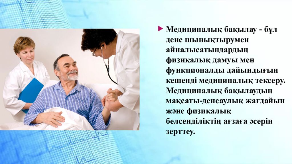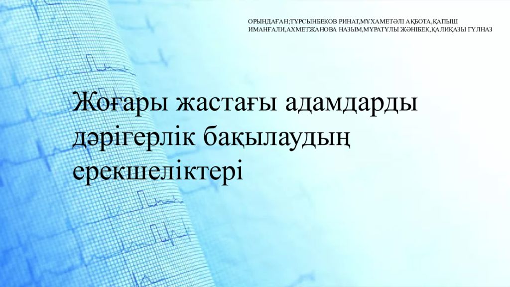 Первый слайд презентации: Жоғары жастағы адамдарды дәрігерлік бақылаудың ерекшеліктері