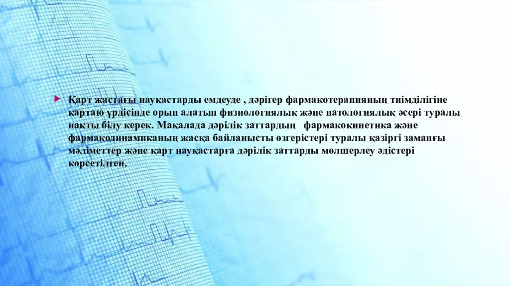 Қарт жастағы науқастарды емдеуде, дәрігер фармакотерапияның тиімділігіне қартаю үрдісінде орын алатын физиологиялық және патологиялық әсері туралы нақты білу керек. Мақалада дәрілік заттардың фармакокинетика және фармакодинамиканың жасқа байланысты өзгерістері туралы қазіргі заманғы мәліметтер және қарт науқастарға дәрілік заттарды мөлшерлеу әдістері көрсетілген.