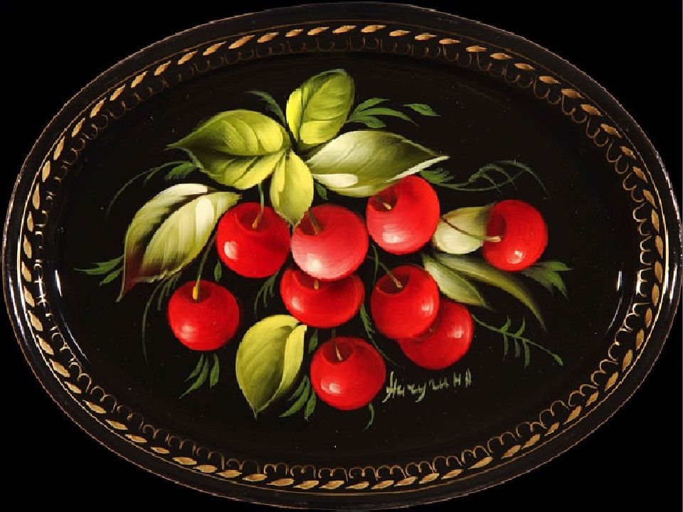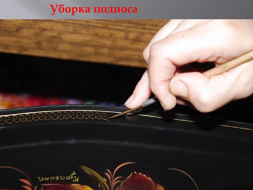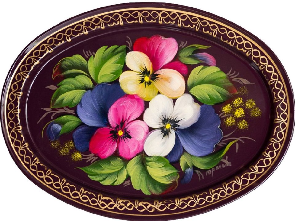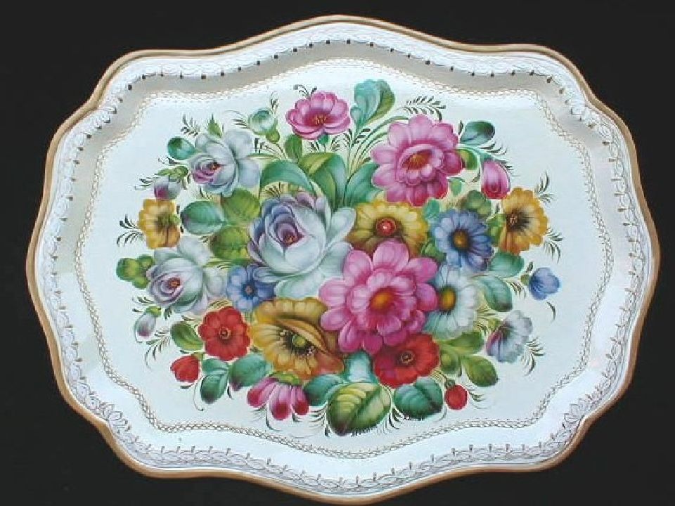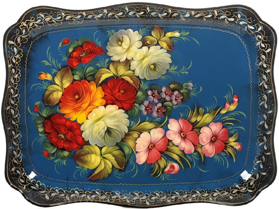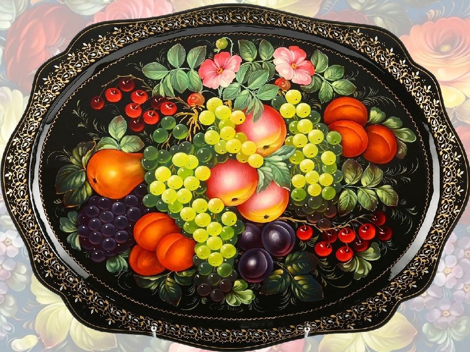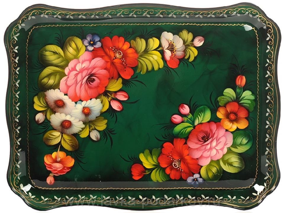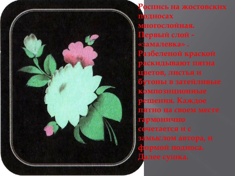 Роспись на жостовских подносах многослойная. Первый слой - « замалевка ». Разбеленой краской раскидывают пятна цветов, листья и бутоны в затейливые композиционные решения. Каждое пятно на своем месте гармонично сочетается и с замыслом автора, и формой подноса. Далее сушка.