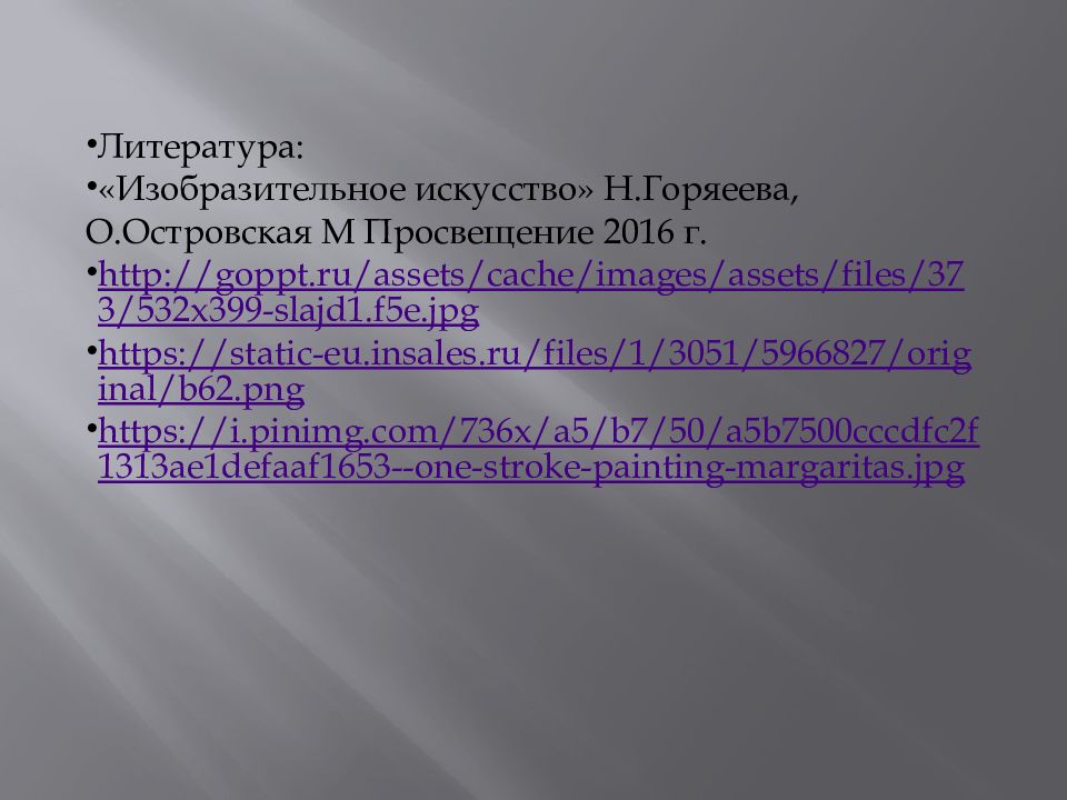 Литература: «Изобразительное искусство» Н.Горяеева, О.Островская М Просвещение 2016 г. http://goppt.ru/assets/cache/images/assets/files/373/532x399-slajd1.f5e.jpg https://static-eu.insales.ru/files/1/3051/5966827/original/b62.png https://i.pinimg.com/736x/a5/b7/50/a5b7500cccdfc2f1313ae1defaaf1653--one-stroke-painting-margaritas.jpg