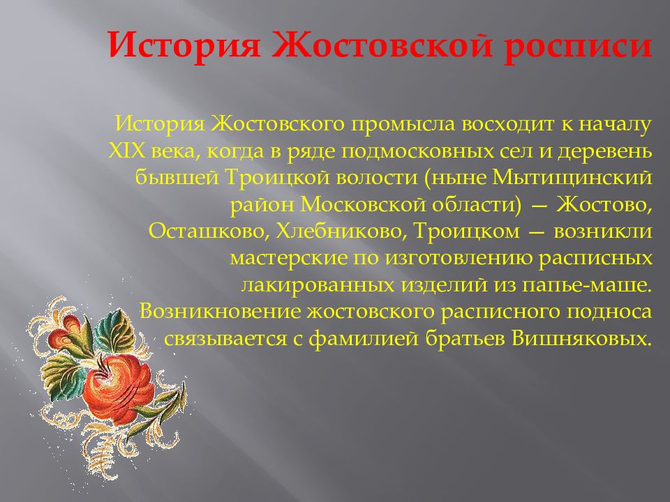 История Ж остовской росписи История Жостовского промысла восходит к началу ХIХ века, когда в ряде подмосковных сел и деревень бывшей Троицкой волости (ныне Мытищинский район Московской области) — Жостово, Осташково, Хлебниково, Троицком — возникли мастерские по изготовлению расписных лакированных изделий из папье-маше. Возникновение жостовского расписного подноса связывается с фамилией братьев Вишняковых.