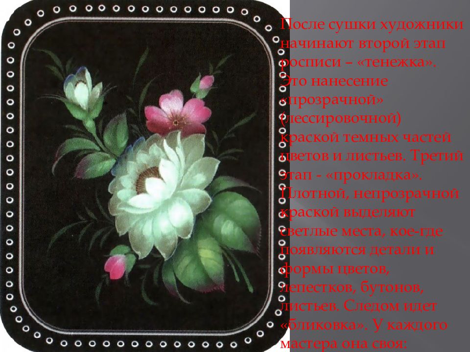 После сушки художники начинают второй этап росписи – « тенежка ». Это нанесение «прозрачной» ( лессировочной ) краской темных частей цветов и листьев. Третий этап - «прокладка». Плотной, непрозрачной краской выделяют светлые места, кое-где появляются детали и формы цветов, лепестков, бутонов, листьев. Следом идет « бликовка ». У каждого мастера она своя: широкая и мягкая, мелкая и дробная