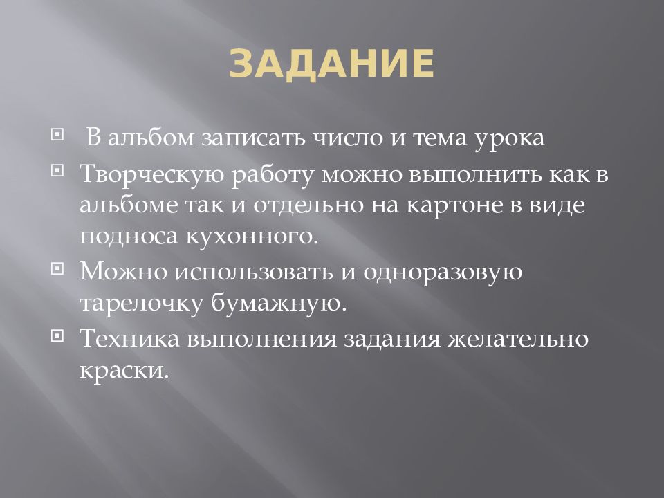 В альбом записать число и тема урока Творческую работу можно выполнить как в альбоме так и отдельно на картоне в виде подноса кухонного. Можно использовать и одноразовую тарелочку бумажную. Техника выполнения задания желательно краски.
