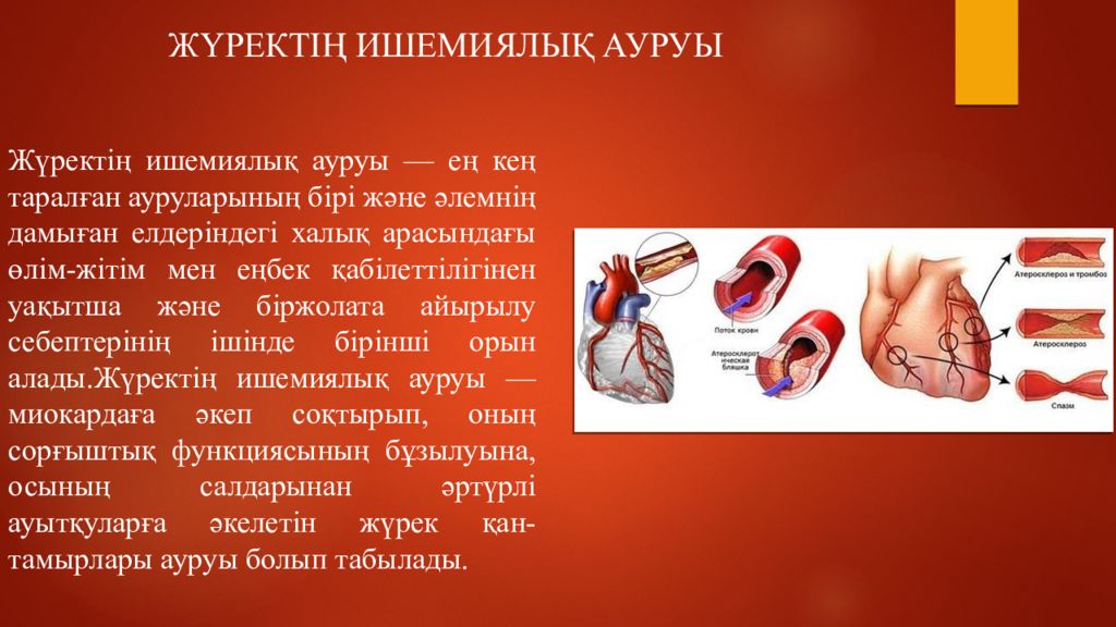ЖҮРЕКТІҢ ИШЕМИЯЛЫҚ АУРУЫ Жүректің ишемиялық ауруы — ең кең таралған ауруларының бірі және әлемнің дамыған елдеріндегі халық арасындағы өлім-жітім мен еңбек қабілеттілігінен уақытша және біржолата айырылу себептерінің ішінде бірінші орын алады.Жүректің ишемиялық ауруы — миокардаға әкеп соқтырып, оның сорғыштық функциясының бұзылуына, осының салдарынан әртүрлі ауытқуларға әкелетін жүрек қан-тамырлары ауруы болып табылады.