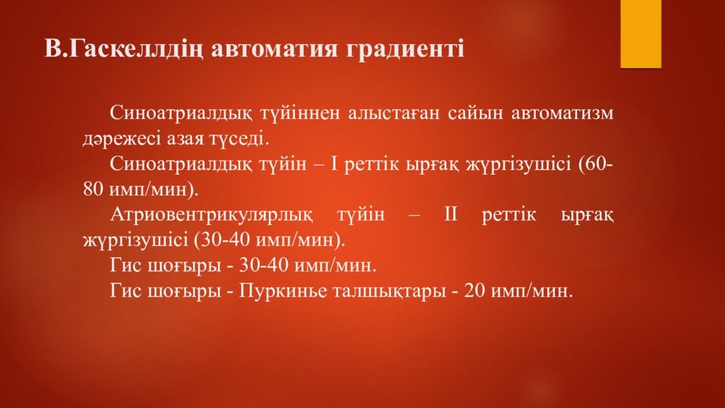 Синоатриалдық түйіннен алыстаған сайын автоматизм дәрежесі азая түседі. Синоатриалдық түйін – І реттік ырғақ жүргізушісі (60-80 имп/мин). Атриовентрикулярлық түйін – ІІ реттік ырғақ жүргізушісі (30-40 имп/мин). Гис шоғыры - 30-40 имп/мин. Гис шоғыры - Пуркинье талшықтары - 20 имп/мин.