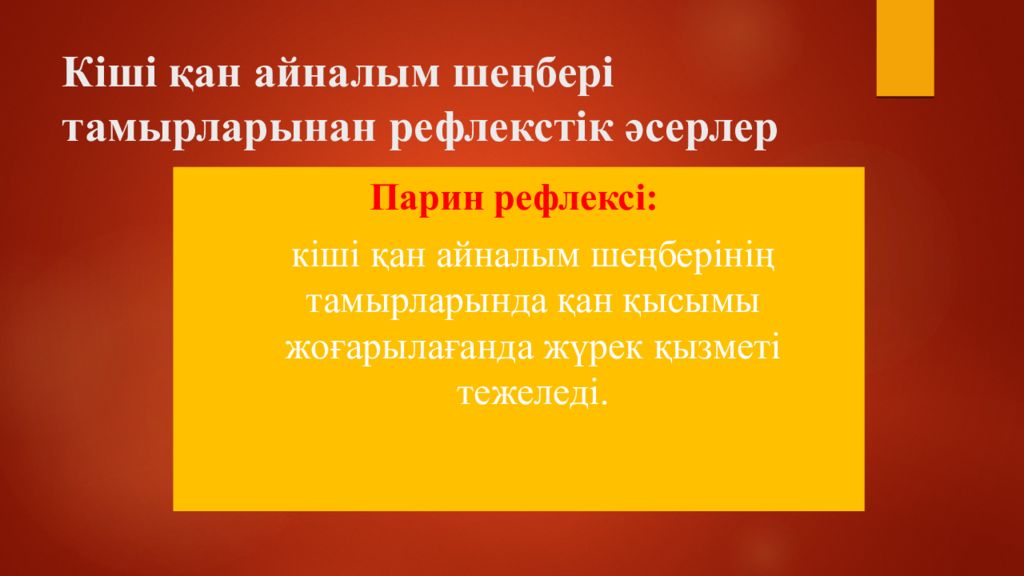 Парин рефлексі : кіші қан айналым шеңберінің тамырларында қан қысымы жоғарылағанда жүрек қызметі тежеледі.