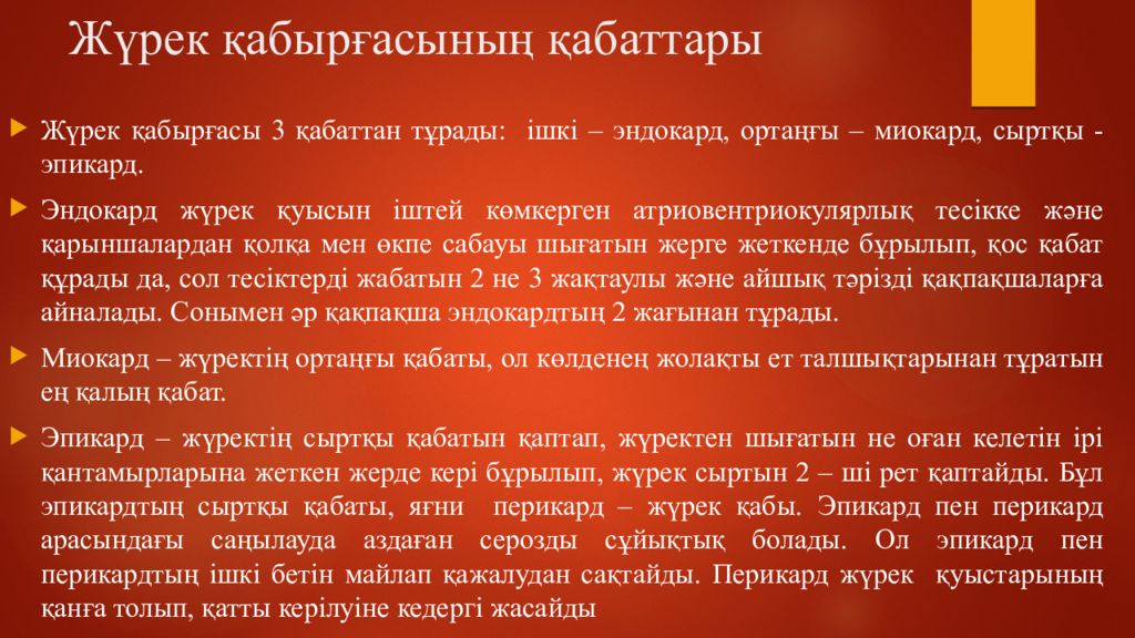 Жүрек қабырғасы 3 қабаттан тұрады: ішкі – эндокард, ортаңғы – миокард, сыртқы -эпикард. Эндокард жүрек қуысын іштей көмкерген атриовентриокулярлық тесікке және қарыншалардан қолқа мен өкпе сабауы шығатын жерге жеткенде бұрылып, қос қабат құрады да, сол тесіктерді жабатын 2 не 3 жақтаулы және айшық тәрізді қақпақшаларға айналады. Сонымен әр қақпақша эндокардтың 2 жағынан тұрады. Миокард – жүректің ортаңғы қабаты, ол көлденең жолақты ет талшықтарынан тұратын ең қалың қабат. Эпикард – жүректің сыртқы қабатын қаптап, жүректен шығатын не оған келетін ірі қантамырларына жеткен жерде кері бұрылып, жүрек сыртын 2 – ші рет қаптайды. Бұл эпикардтың сыртқы қабаты, яғни перикард – жүрек қабы. Эпикард пен перикард арасындағы саңылауда аздаған серозды сұйықтық болады. Ол эпикард пен перикардтың ішкі бетін майлап қажалудан сақтайды. Перикард жүрек қуыстарының қанға толып, қатты керілуіне кедергі жасайды