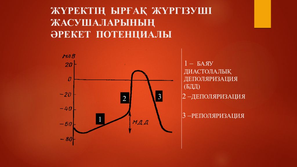 1 2 3 1 – БАЯУ ДИАСТОЛАЛЫҚ ДЕПОЛЯРИЗАЦИЯ (БДД) 2 – ДЕПОЛЯРИЗАЦИЯ 3 – РЕПОЛЯРИЗАЦИЯ