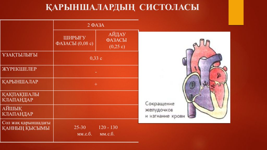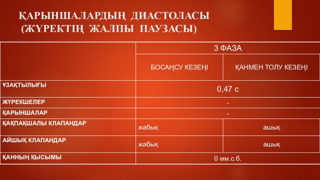 3 ФАЗА БОСАҢСУ КЕЗЕҢІ ҚАНМЕН ТОЛУ КЕЗЕҢІ ҰЗАҚТЫЛЫҒЫ 0,47 с ЖҮРЕКШЕЛЕР - ҚАРЫНШАЛАР - ҚАҚПАҚШАЛЫ КЛАПАНДАР жабық ашық АЙШЫҚ КЛАПАНДАР жабық ашық ҚАННЫҢ ҚЫСЫМЫ 0 мм.с.б.
