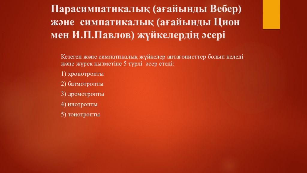 Слайд 29: Парасимпатикалық (ағайынды Вебер) және симпатикалық (ағайынды Цион мен И.П.Павлов) жүйкелердің әсері