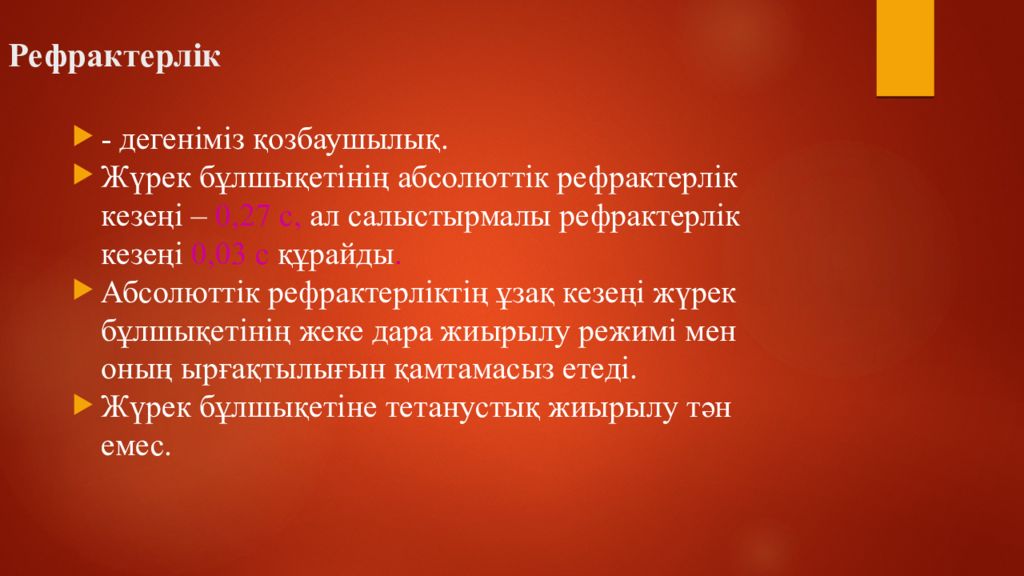 - дегеніміз қозбаушылық. Жүрек бұлшықетінің абсолюттік рефрактерлік кезеңі – 0,27 с, ал салыстырмалы рефрактерлік кезеңі 0,03 с құрайды. Абсолюттік рефрактерліктің ұзақ кезеңі жүрек бұлшықетінің жеке дара жиырылу режимі мен оның ырғақтылығын қамтамасыз етеді. Жүрек бұлшықетіне тетанустық жиырылу тән емес.