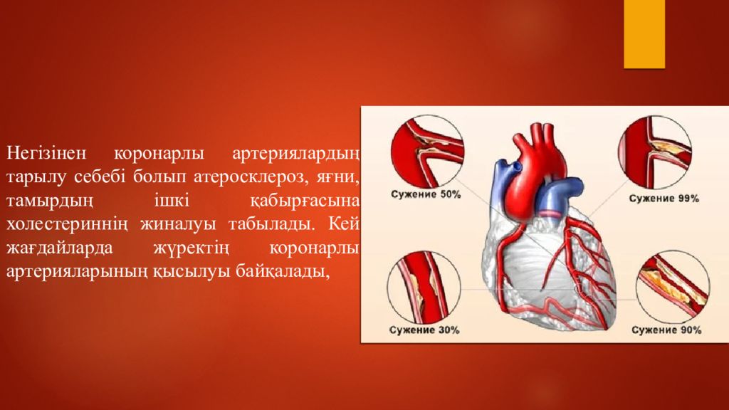 Холестериннің жиналуы нәтижесінде артерияларлың ішкі саңылауы тарылып, миокарданың қанмен қамтамасыз етуі азаяды да, әсіресе адамға физикалық күш түскен кезде жүрек жиі соғып, оған жеткізілетін ауа мен қан мөлшері жеткіліксіз болады да, жүрек аймағында аурыру белгілері пайда болады (жүрек талмасы және т.б.).